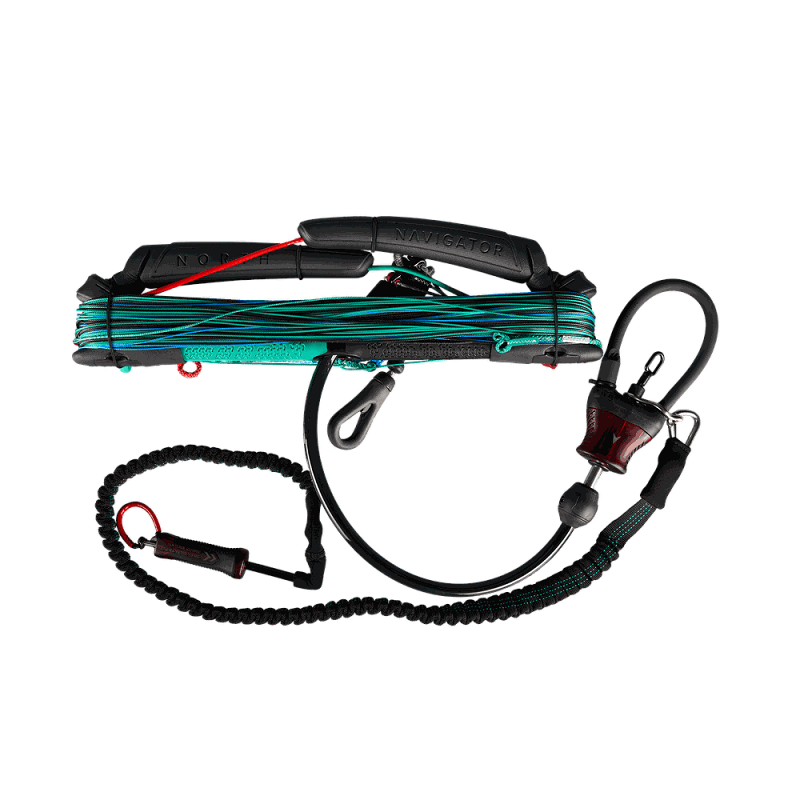 North Navigator to zaawansowany bar, zaprojektowany z myślą o intuicyjnym i precyzyjnym sterowaniu latawcem. Posiada ergonomiczny chwyt o lekko owalnym kształcie, co umożliwia naturalny chwyt i łatwe wyczucie prawidłowej orientacji. Dostępny regulowanym rozmiarze: 38-43 cm, co pozwala na dostosowanie długości do preferencji użytkownika. Zmiana długości odbywa się poprzez obrócenie pływaków na końcach baru o 180 stopni. System depower oparty na regulacji za pomocą knagi umożliwia precyzyjne dostosowanie mocy latawca w zależności od warunków. Linka main line jest pokryta specjalną osłoną z TPU, co zwiększa jej trwałość i odporność na ścieranie. Bar wyposażony jest w wysokiej jakości linki Dyneema SK99 o długości 22 metrów (12 m + 10 m), które charakteryzują się niską rozciągliwością i minimalnym oporem aerodynamicznym. System szybkiego wypięcia Connect Quick Release został zaprojektowany z myślą o bezpieczeństwie i łatwości obsługi. Czerwony uchwyt QR jest ergonomicznie ukształtowany, co umożliwia intuicyjne i szybkie wypięcie w sytuacjach awaryjnych. Dodatkowo, bar posiada obrotowy pierścień do mocowania leasha, co zapobiega skręcaniu się linki bezpieczeństwa.