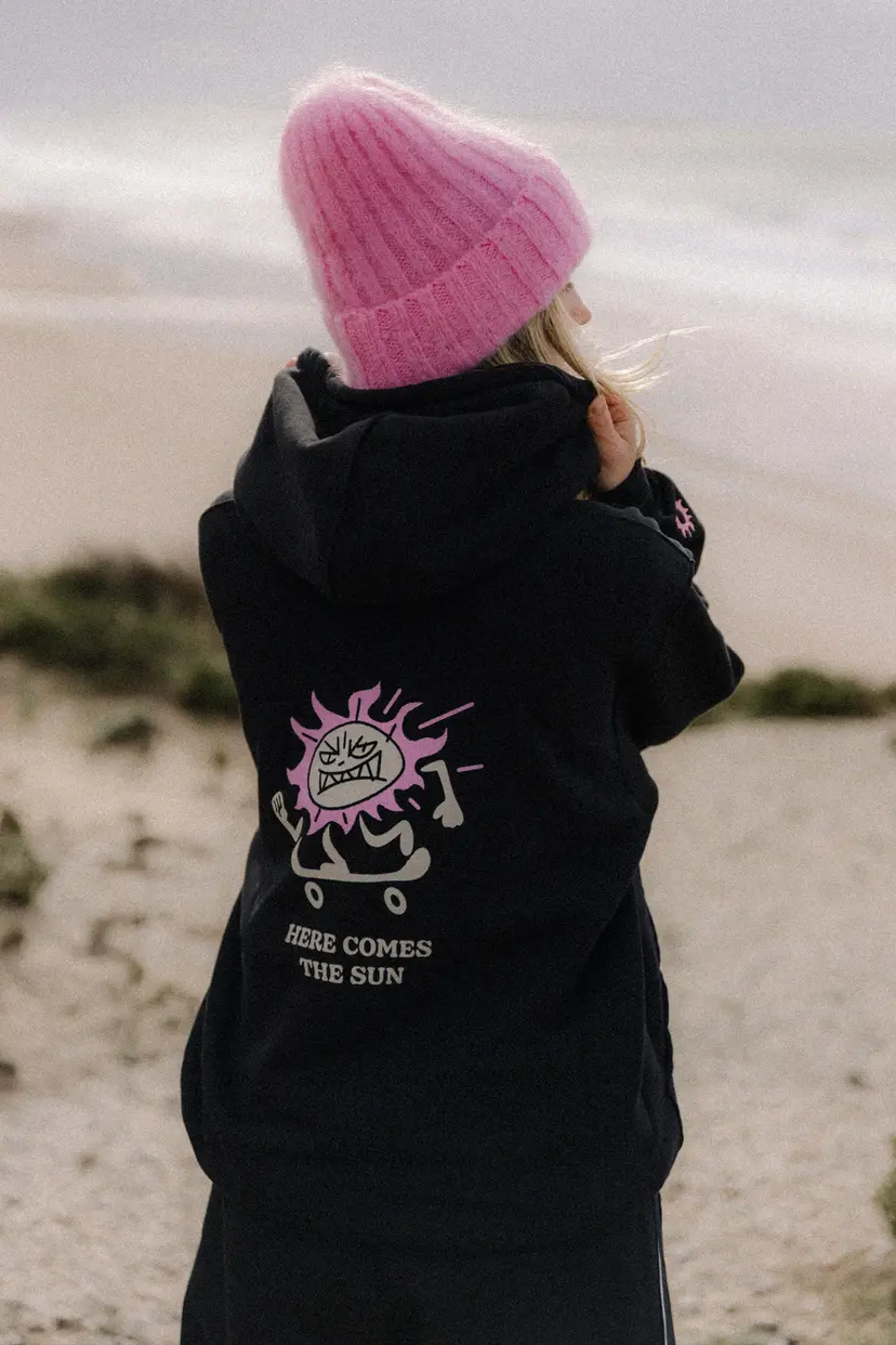Na przodzie nadruk metodą wodną tak zwanym - " wywabem" - napis "Here comes the sun", na plecach Słoneczko. Inspiracja klasycznym surf stylem z lat 90.