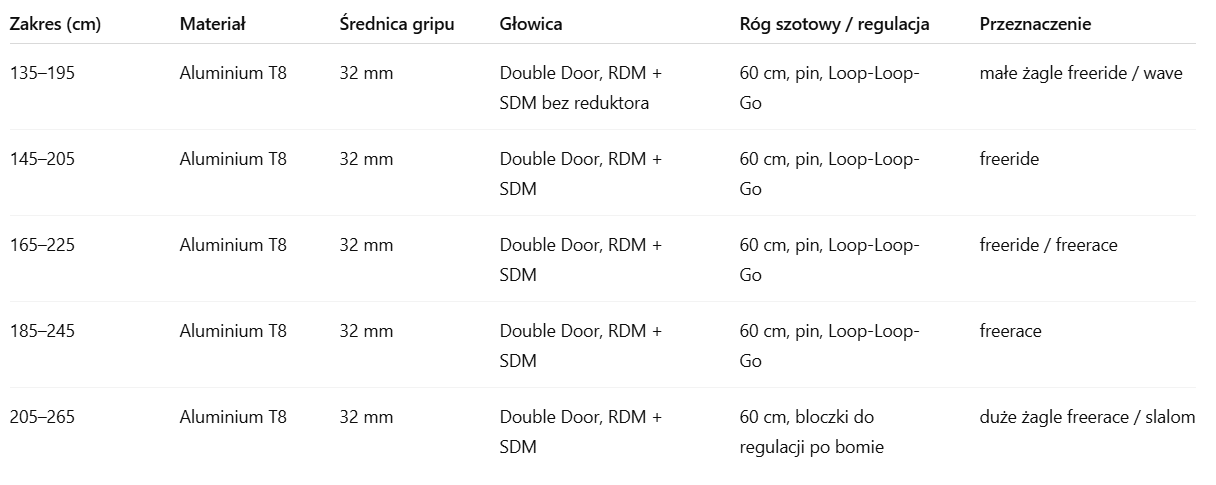 Charakteryzuje się bardzo sztywnym połączeniem z rurami dzięki zastosowaniu czterech nierdzewnych śrub imbusowych. Głowica jest uniwersalna – pozwala na zapięcie na masztach typu RDM bez potrzeby używania dodatkowych reduktorów. Wewnątrz znajduje się gumowy protektor, który chroni maszt przed zarysowaniem i amortyzuje drgania. - Nok (Róg szotowy): Wykonany z jednego elementu, co znacząco podnosi sztywność całej konstrukcji. Zastosowano system podwójnych pinów do regulacji długości oraz szybki mechanizm wiązania „Loop-Loop-Go”.