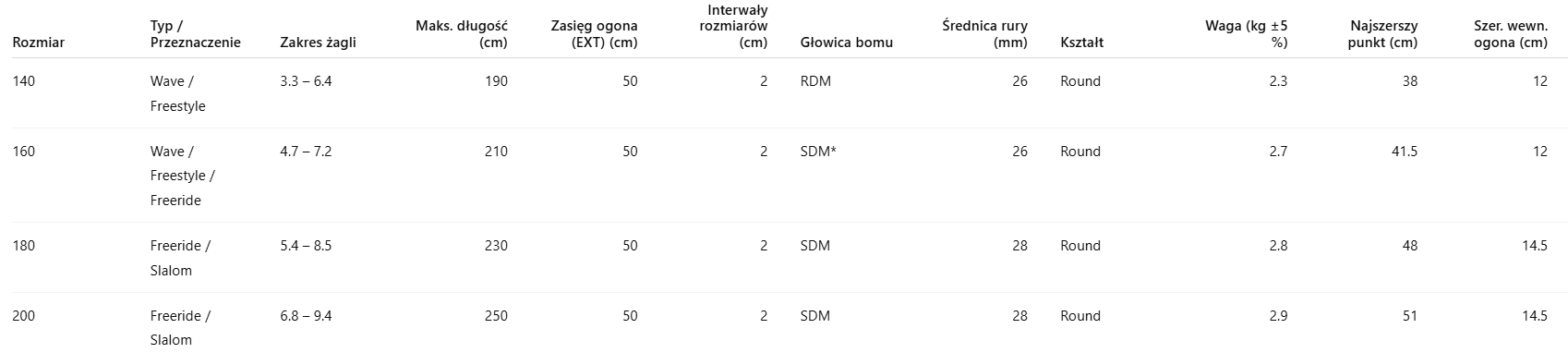 Konstrukcja wykorzystuje system podwójnego pinu w części regulowanej, co usztywnia połączenie z nokiem i poprawia reakcję całego zestawu na ruchy żagla. Zakres regulacji długości jest szeroki, z gęstymi interwałami ustawień, dzięki czemu łatwo dopasować bom do różnych rozmiarów żagli i preferencji trymu. Przednia głowica została zaprojektowana tak, aby stabilnie trzymać się masztu i pracować osiowo, bez bocznych luzów, co przekłada się na pewne czucie zestawu. Bom współpracuje z masztami SDM oraz RDM przy użyciu adaptera, a w większych rozmiarach dostępny jest system bloczków w ogonie, który ułatwia precyzyjną regulację outhaulu pod obciążeniem. Całość tworzy wytrzymały i przewidywalny element zestawu, dobrze sprawdzający się w freeride, freewave i bardziej sportowym pływaniu.