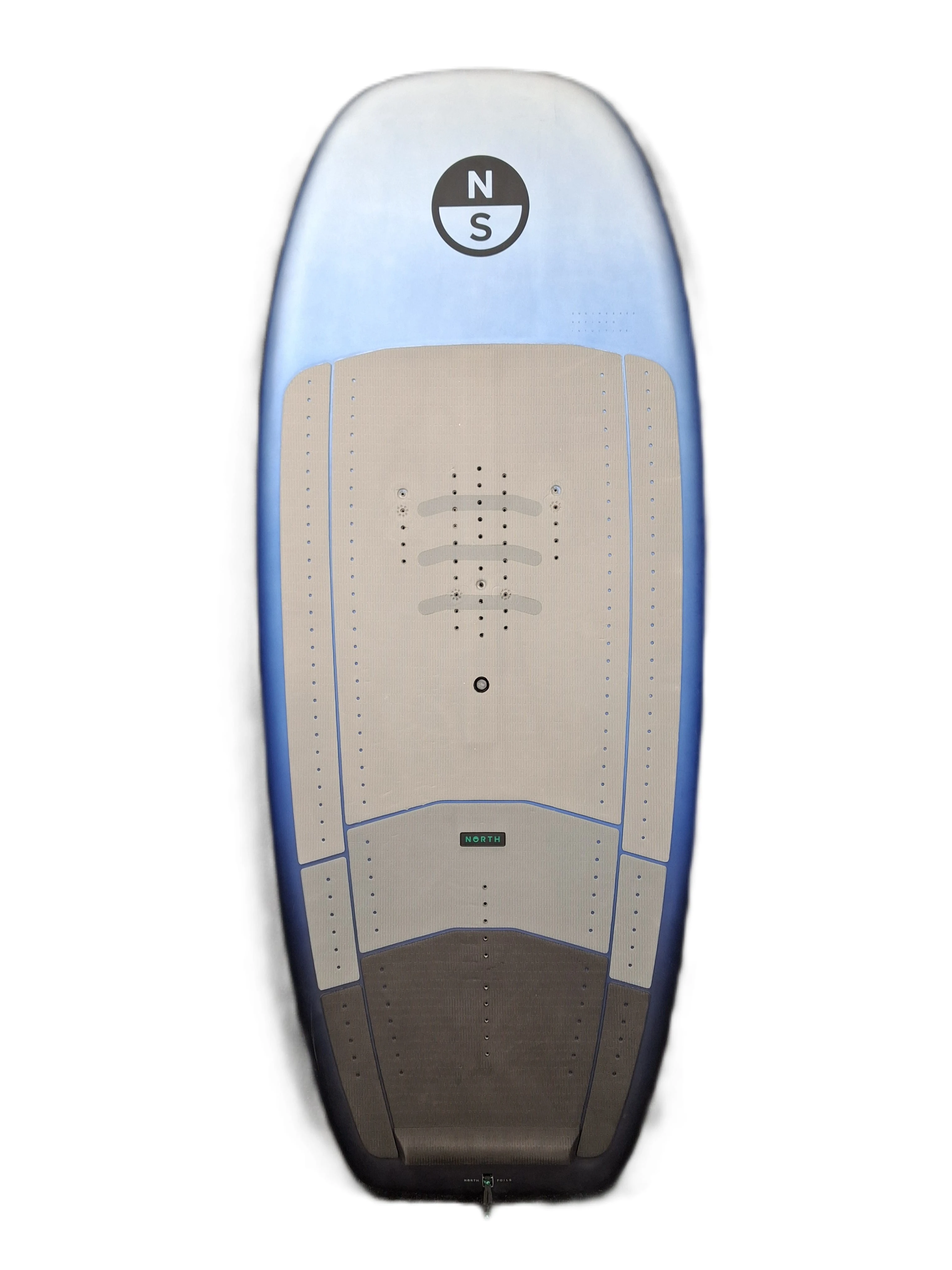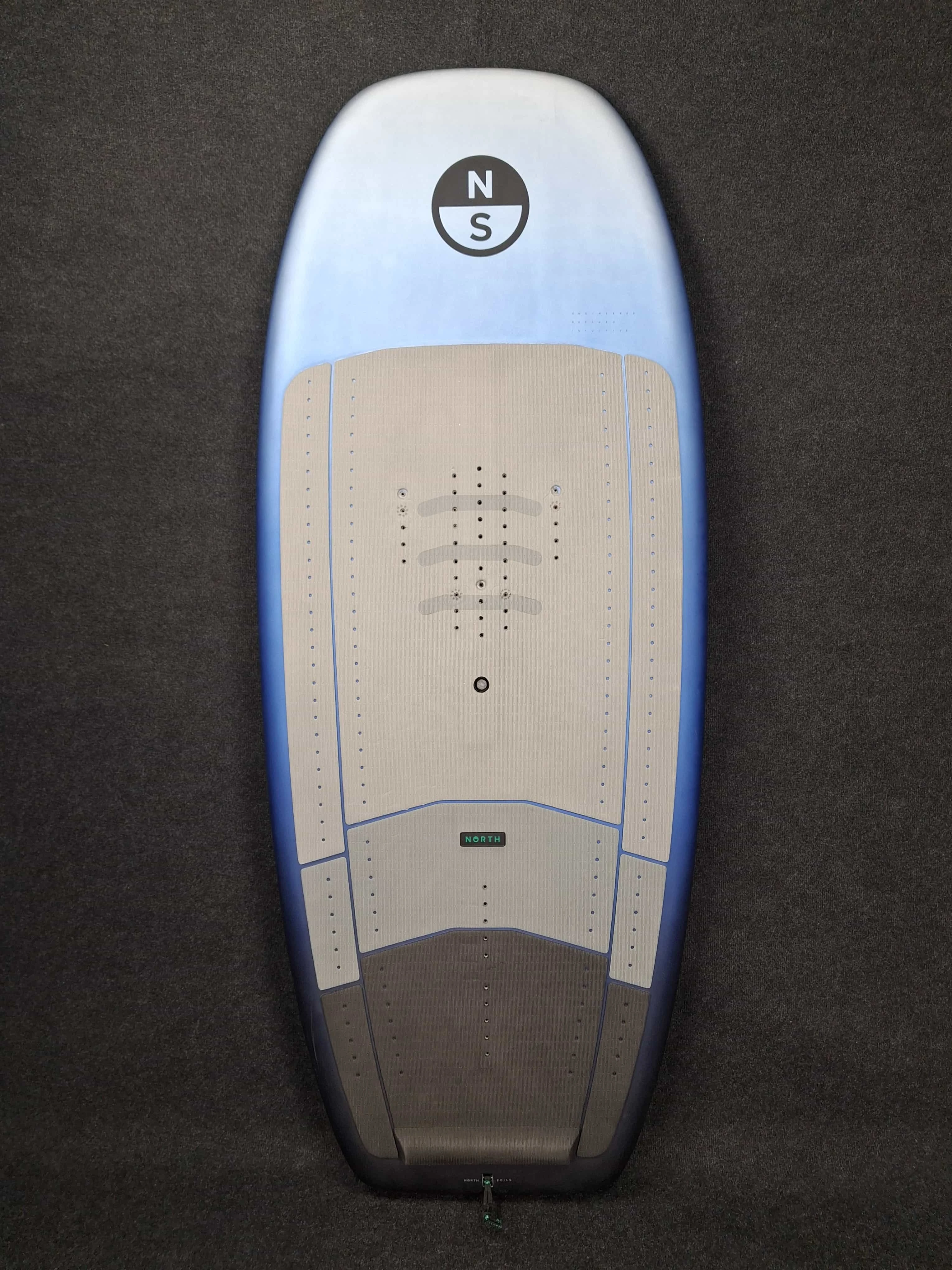 Non-abrasive Max-Traction deck grip w North Seek 2025 to niestandardowa, wytłoczona powierzchnia, która ułatwia szybkie i precyzyjne ustawienie stóp, zapewniając bardziej intuicyjne połączenie z foilem. Wbudowany kickpad na tailu oraz poprzeczne oznaczenia stanowią dodatkowy, dotykowy i wizualny punkt odniesienia dla prawidłowej pozycji stóp - Zintegrowany uchwyt do przenoszenia