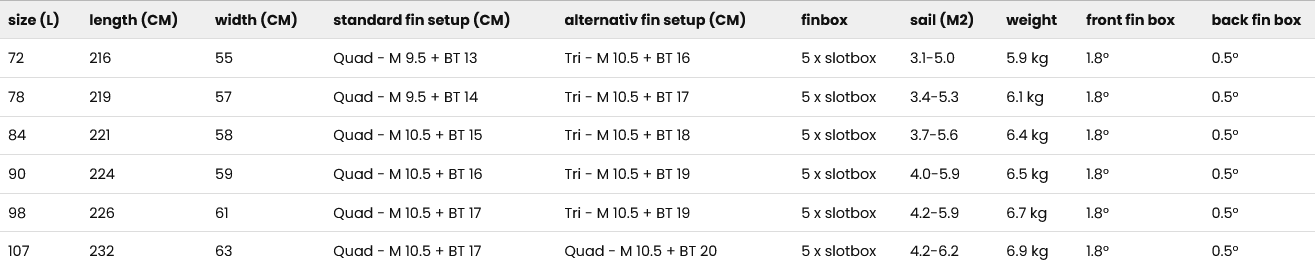 na jeszcze bardziej pionową jazdę, jednocześnie dając desce lepszy flow w górnym skręcie. Model 98 zamiast tego ma nieco dłuższą i węższą rufę, aby dodać wczesne wsparcie strugania dla większych facetów i większych żagli.