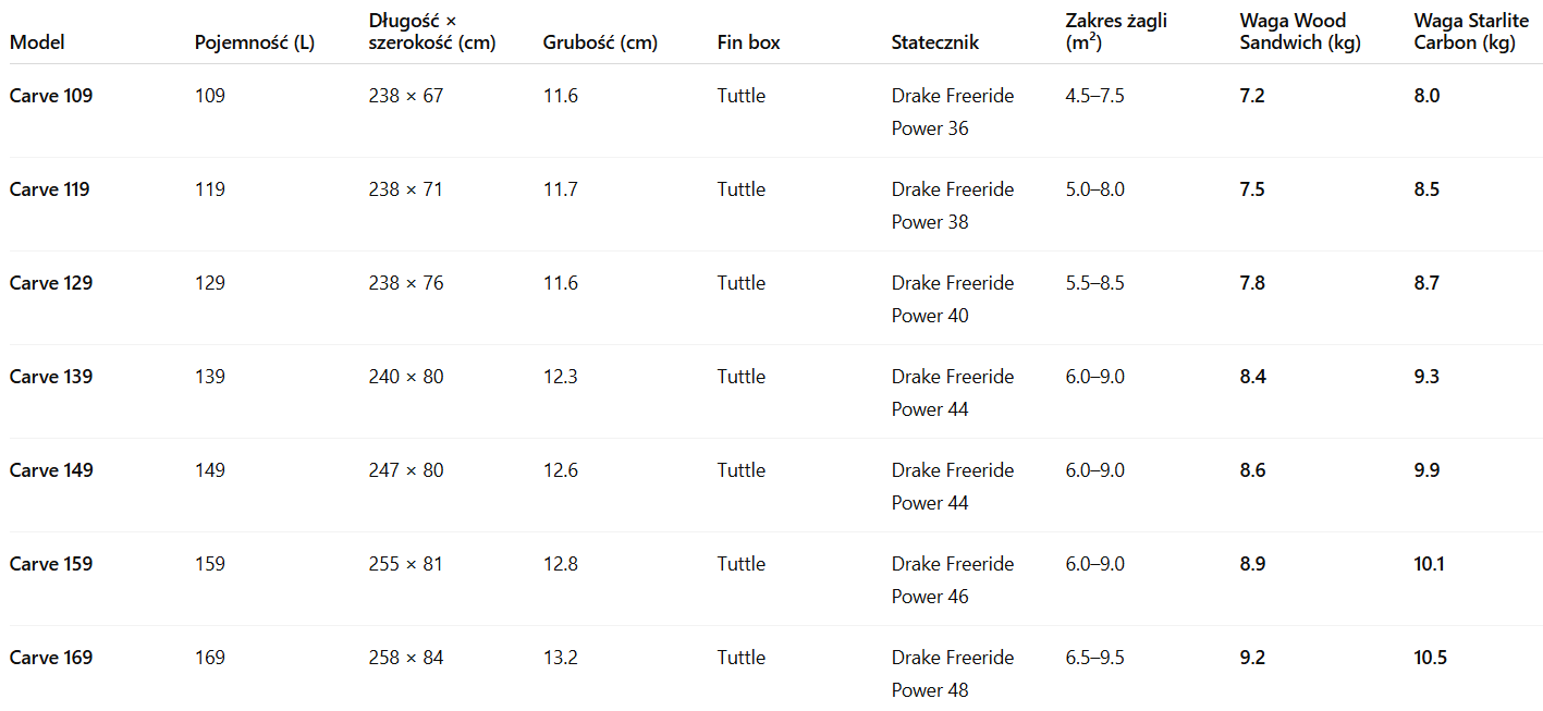 Łatwe, pasywne wchodzenie w ślizg bez większego wysiłku. Wydłużenie płaskiej sekcji rockera na rufie w modelach CARVE ułatwia przyspieszanie do naturalnego progu ślizgu, utrzymując deskę w ślizgu przez dziury wiatrowe i zmniejszając krytyczne znaczenie precyzyjnego trymu. - Ekstra komfort