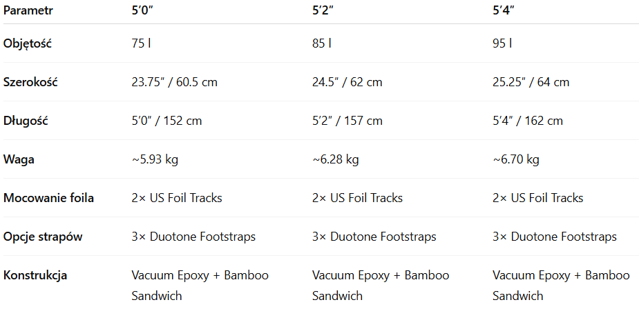 Dostępna w rozmiarach 5'0" (75 l), 5'2" (85 l) i 5'4" × 25.25" (95 l), Sky Style pasuje do szerokiego zakresu wingfoilerów — od rozwijających się średniozaawansowanych po doświadczonych.