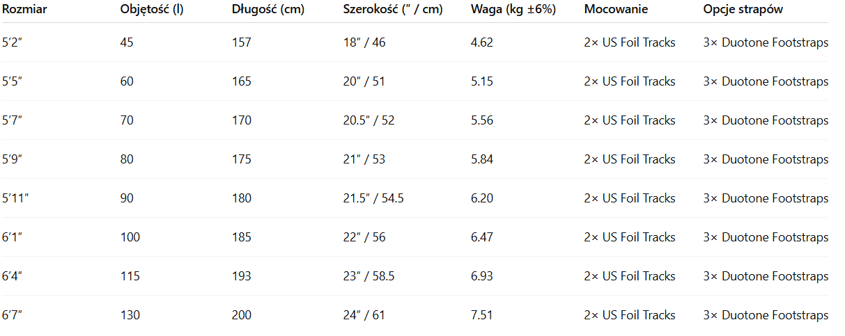 Obniżony pokład ustawia stopy bliżej foila, zapewniając bardziej bezpośrednie czucie i lepszą kontrolę. Wydłużone karbonowe szyny montażowe oraz wiele opcji ustawienia strapów pozwalają dopasować konfigurację do własnych preferencji. Konstrukcja Biax Carbon PVC Sandwich łączy niską wagę, wysoką wytrzymałość i długotrwałą trwałość.