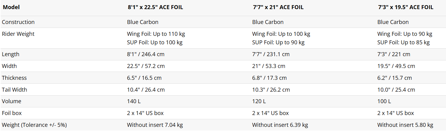 Kształt dzióba w formie „vee” i duże relingi nosowe sprawiają, że deska jest stabilna, łatwa w prowadzeniu i szybko przyspiesza, umożliwiając płynne oderwanie foila od wody. Charakterystyczny pin-tail i kanciaste relingi zapewniają łatwe prowadzenie, stabilność i pewne trzymanie kursu. Seria Ace dostępna jest również w dłuższej i węższej wersji, co umożliwia szybsze przyspieszenie i łatwiejsze pływanie downwind, zachowując jednocześnie przyjazność dla użytkownika w sportach crossoverowych na foilu.