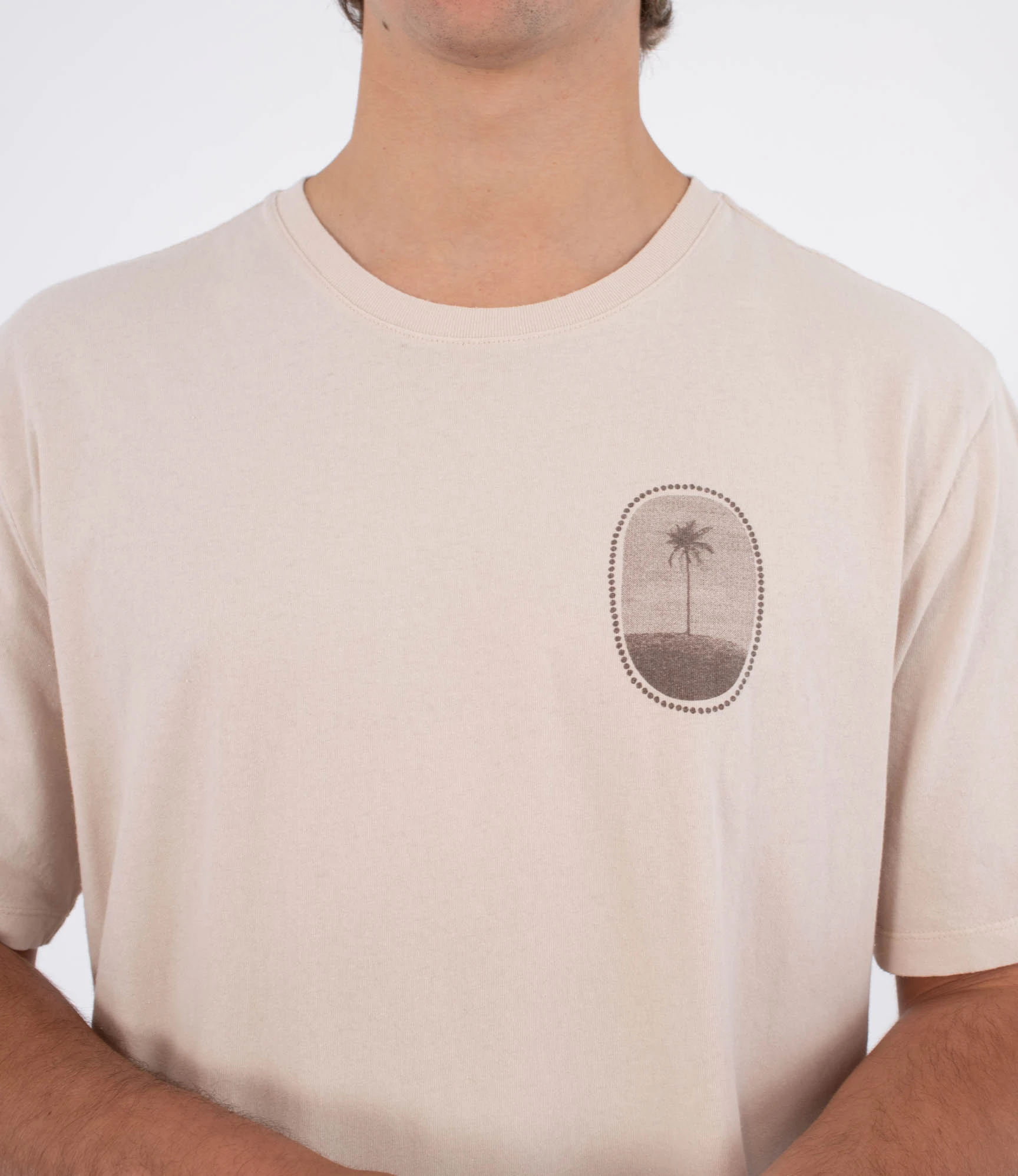 Model posiada klasyczny krój Regular Fit, który dobrze układa się na sylwetce i nie krępuje ruchów. Z przodu znajduje się subtelna grafika na piersi, natomiast tył koszulki zdobi duży, oryginalny nadruk z motywem palmy, inspirowany klimatem plaży i wolności.