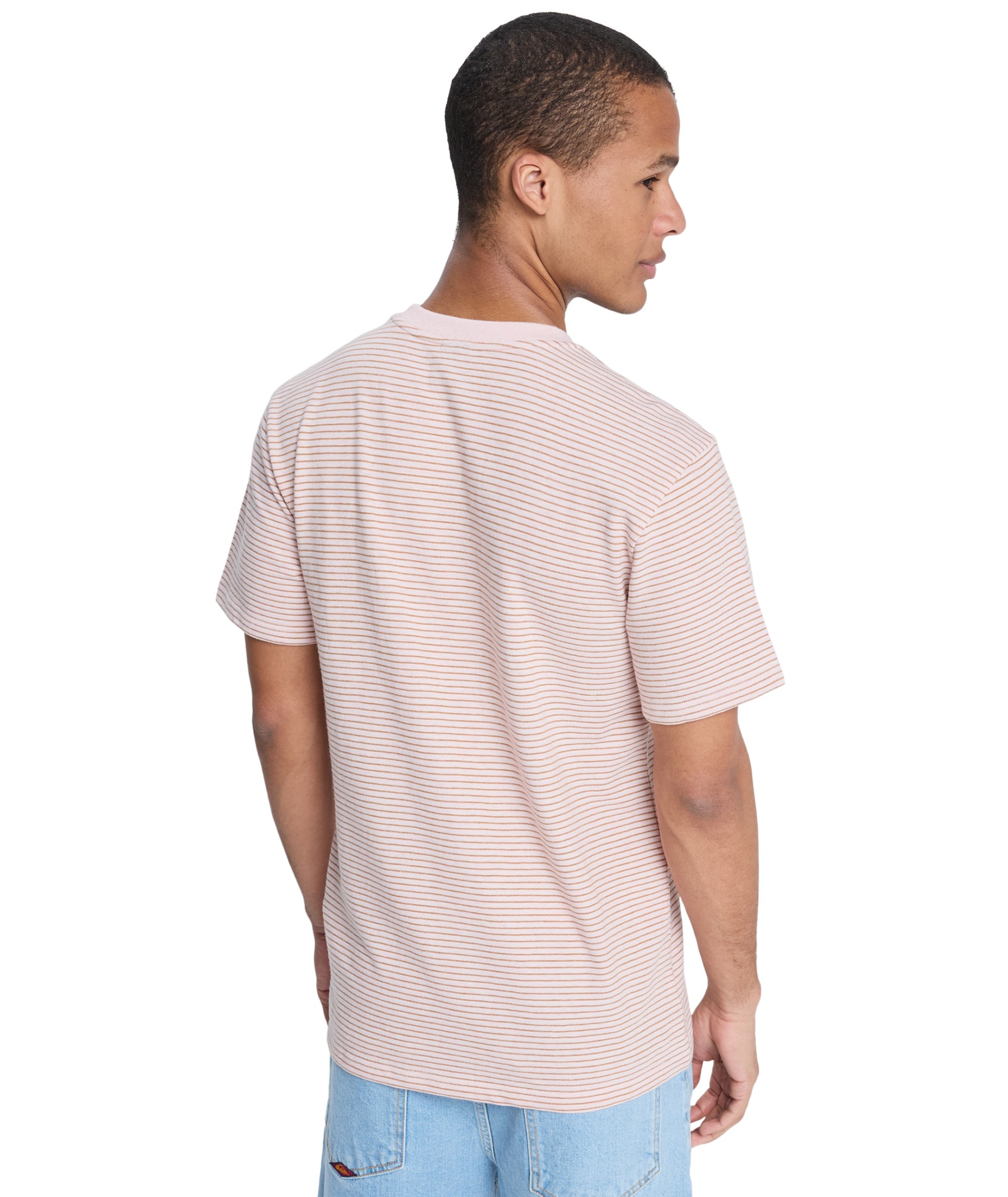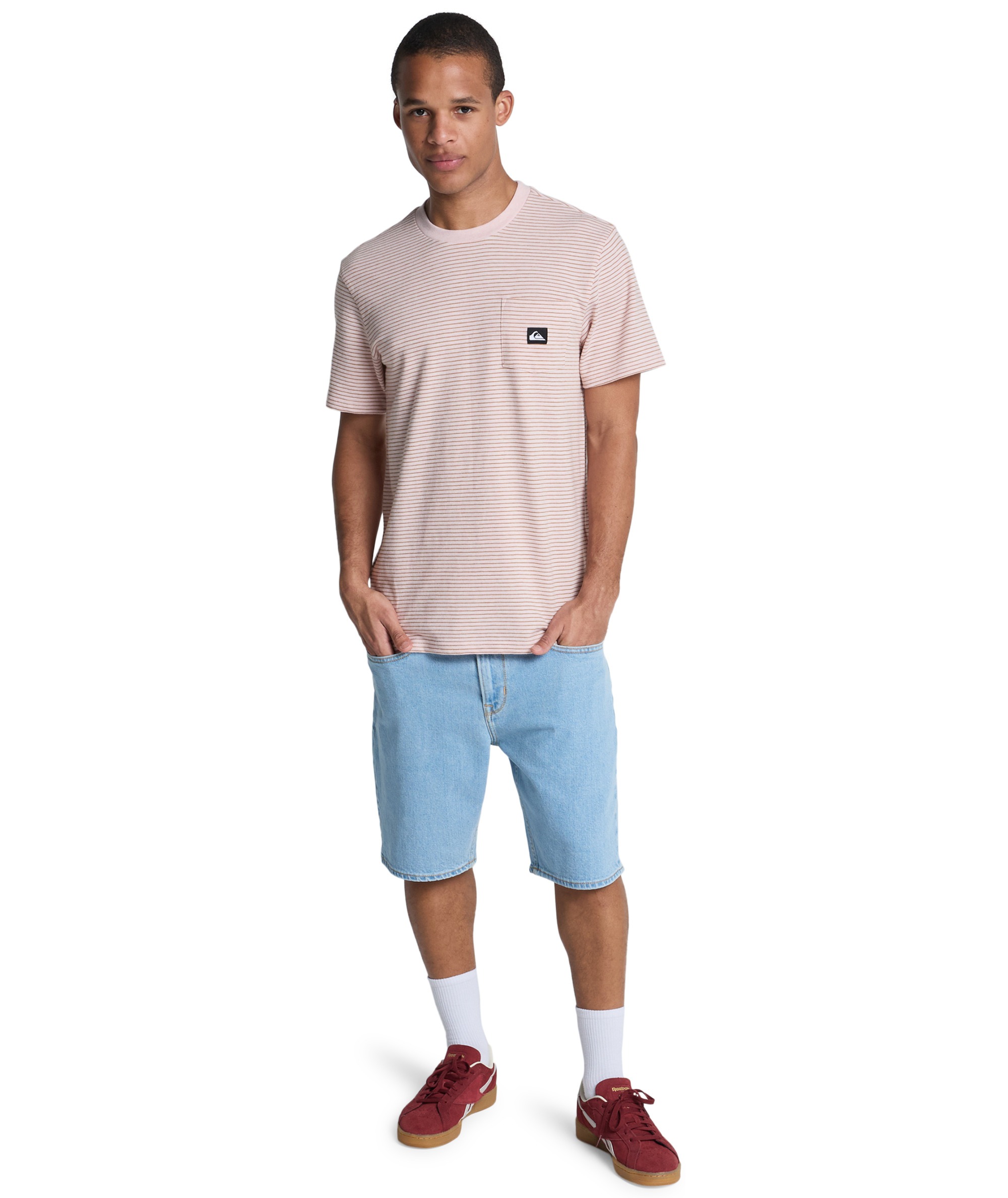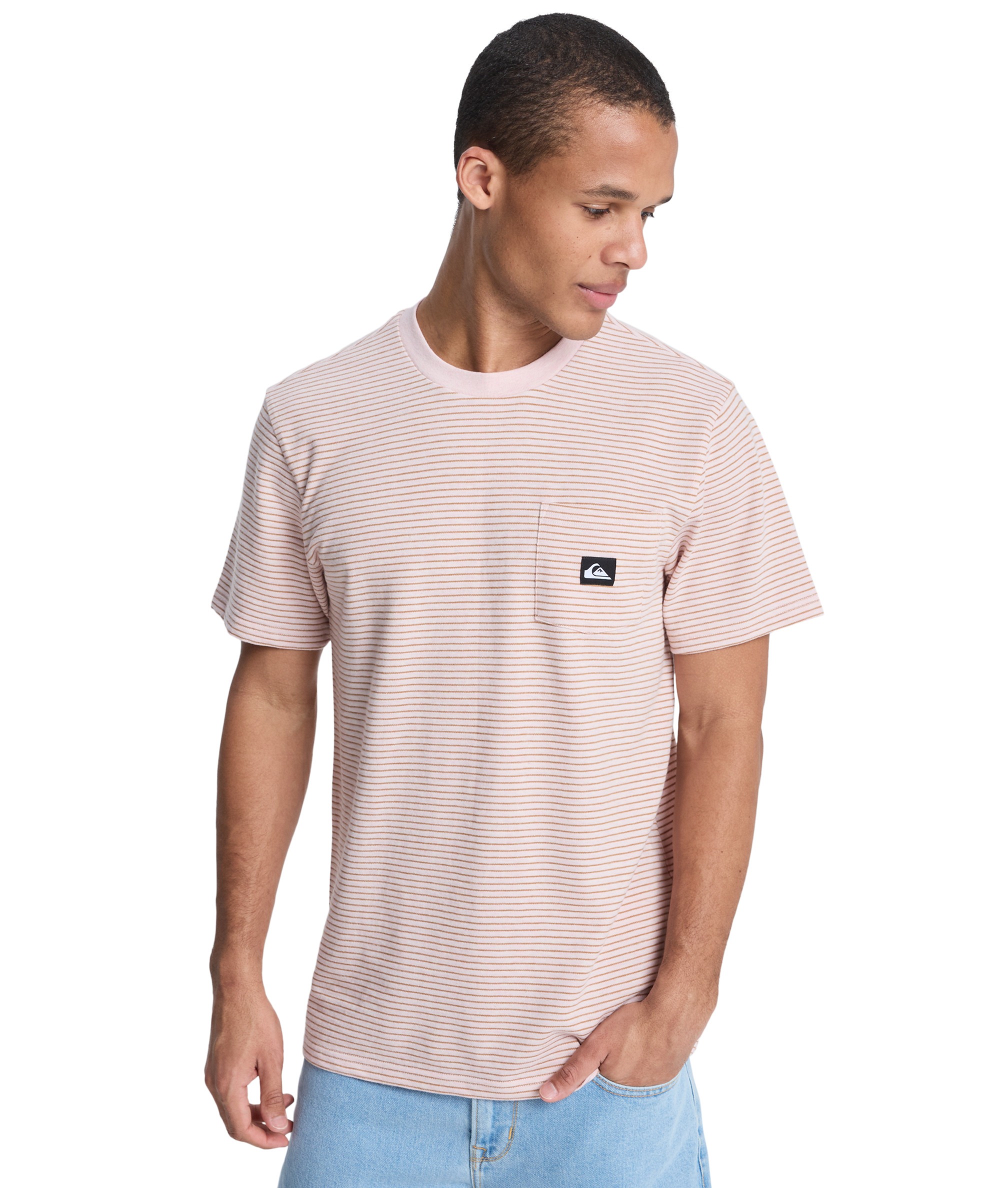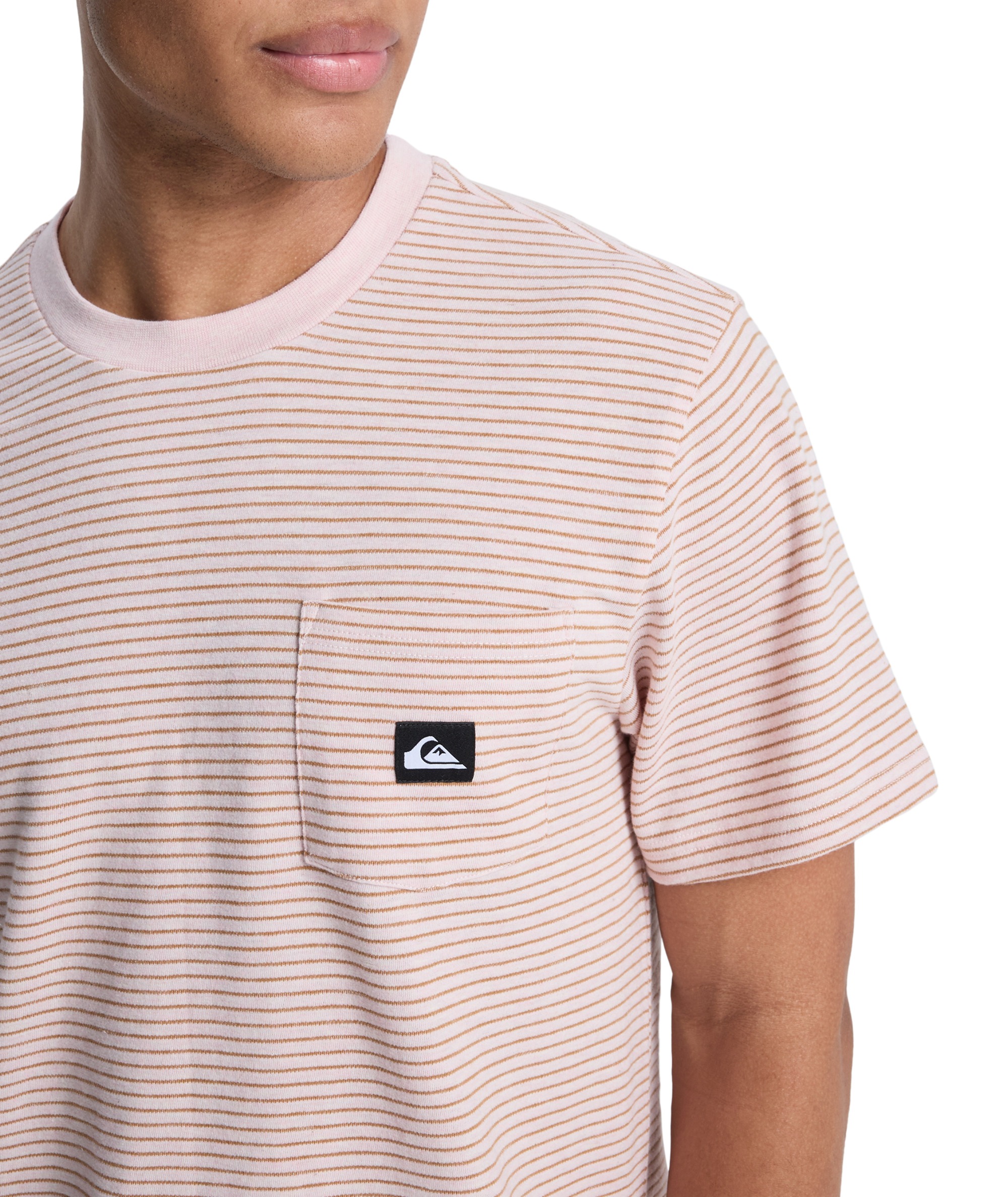 T-shirt LOPAZ STRIPED SS POCKET to modna i wygodna propozycja dla miłośników casualowego stylu z nutą ekologii. Wykonany z wysokiej jakości dzianiny jersey, łączącej 70% bawełny i 30% poliestru, z nadrukiem w klasyczne, przędzy farbowane paski (yarn dye stripes). Koszulka posiada regularny krój oraz wykończony ściągaczem kołnierzyk, który zapewnia komfort i trwałość. Charakterystycznym elementem jest praktyczna kieszonka na piersi z naszywaną tkana metką Quiksilver z materiałów z recyklingu – detal podkreślający dbałość marki o środowisko.