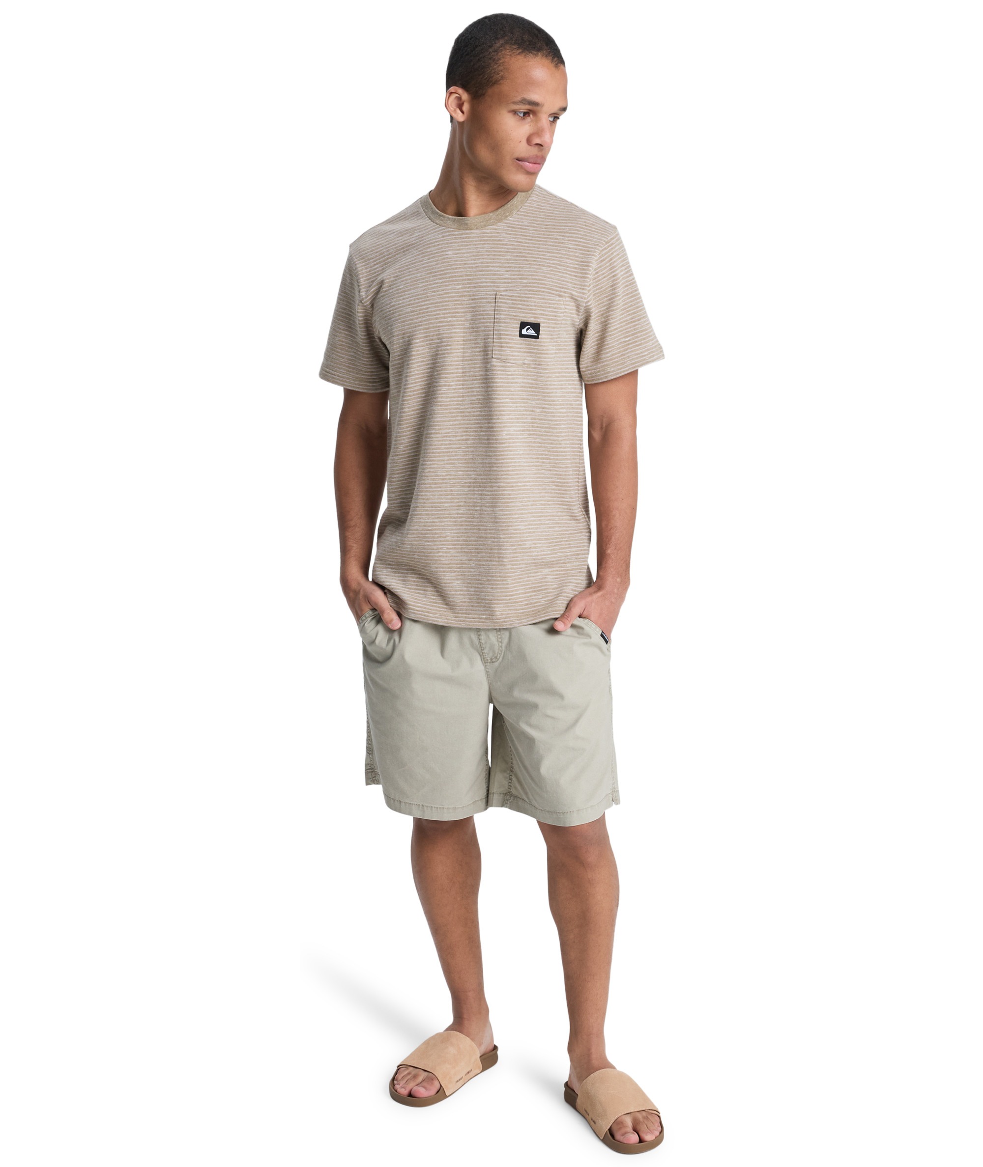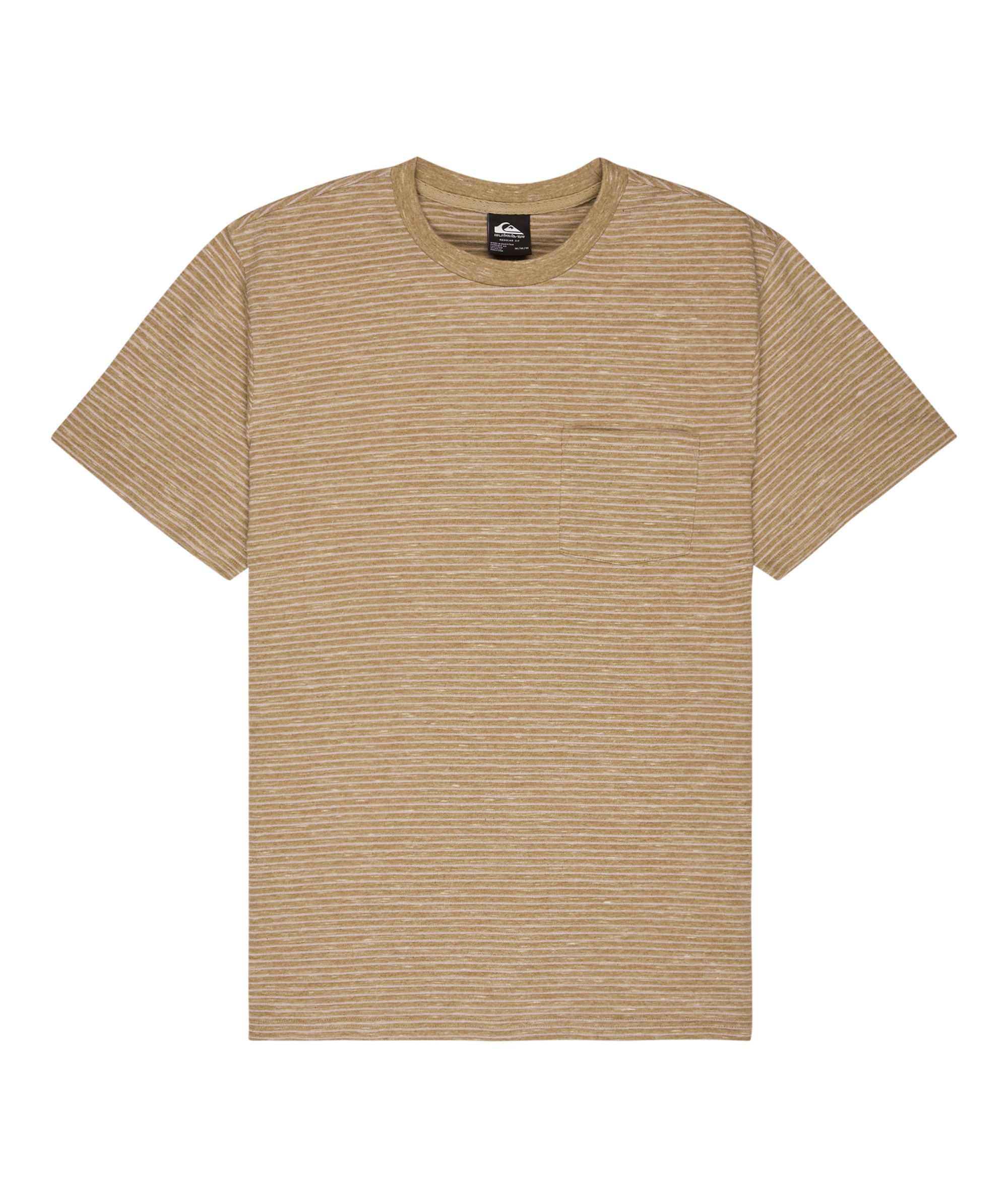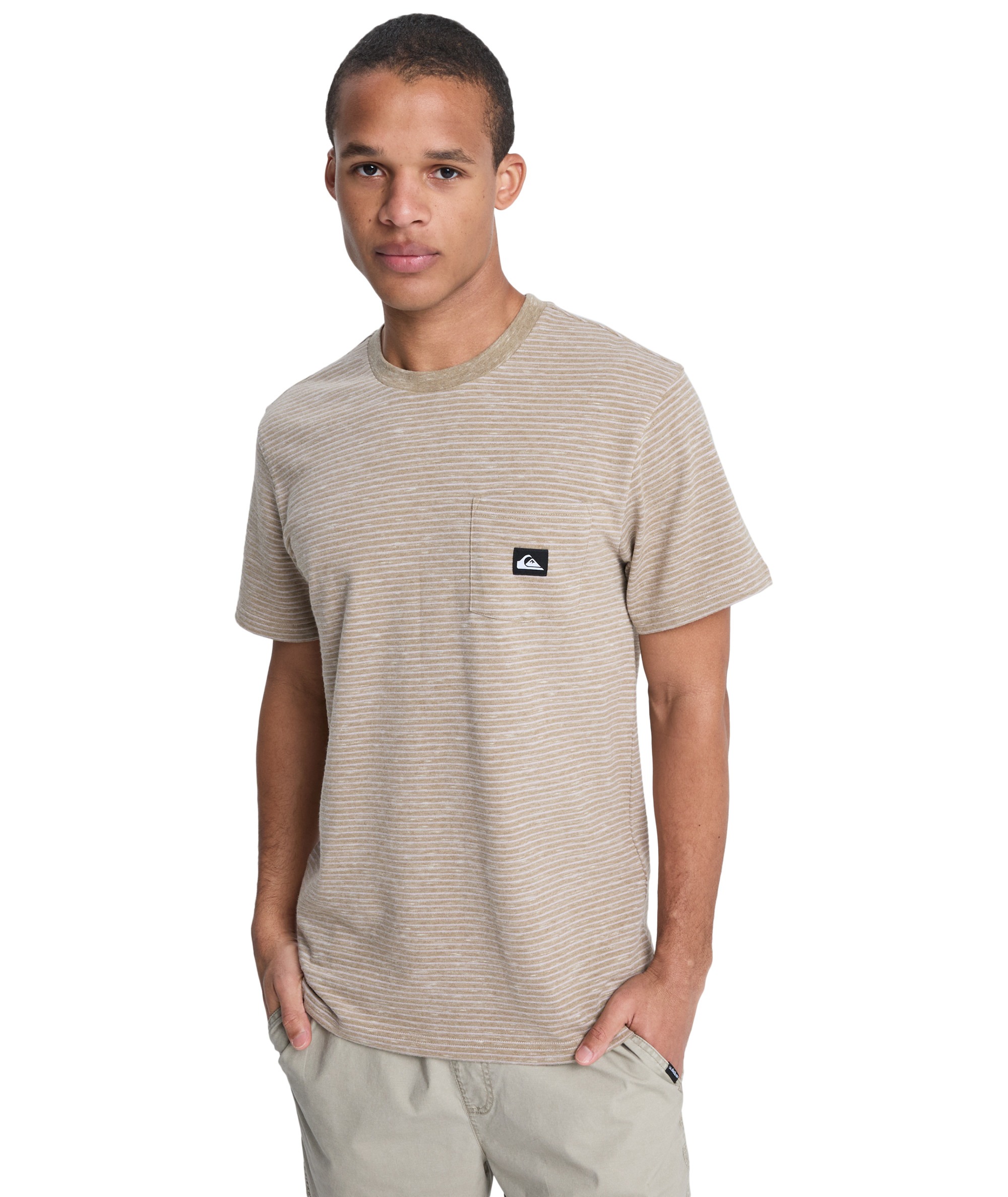 T-shirt LOPAZ STRIPED SS POCKET to modna i wygodna propozycja dla miłośników casualowego stylu z nutą ekologii. Wykonany z wysokiej jakości dzianiny jersey, łączącej 70% bawełny i 30% poliestru, z nadrukiem w klasyczne, przędzy farbowane paski (yarn dye stripes). Koszulka posiada regularny krój oraz wykończony ściągaczem kołnierzyk, który zapewnia komfort i trwałość. Charakterystycznym elementem jest praktyczna kieszonka na piersi z naszywaną tkana metką Quiksilver z materiałów z recyklingu – detal podkreślający dbałość marki o środowisko.