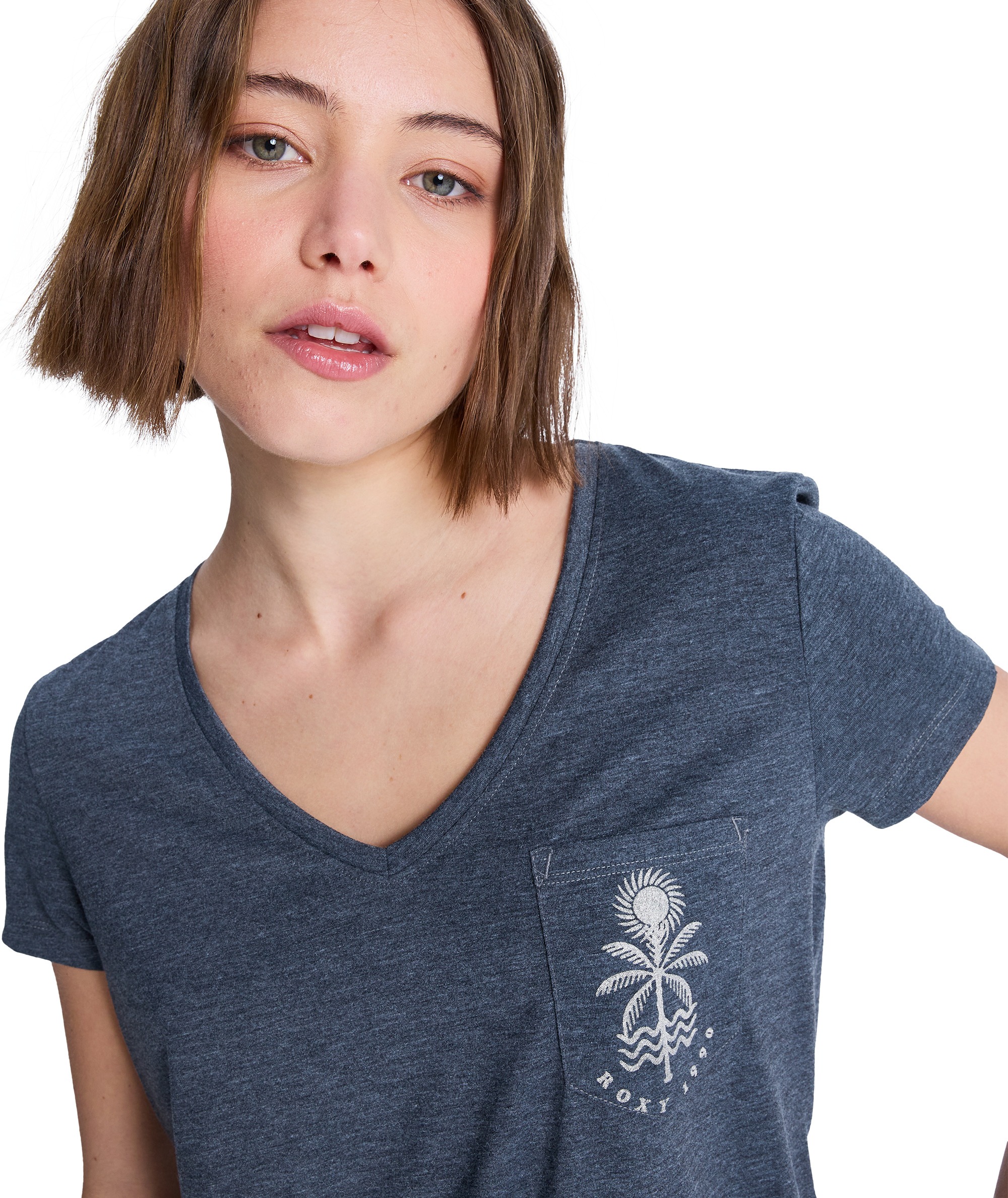 Model posiada głęboki dekolt w szpic (V-neck) z wykończeniem ściągaczem, praktyczną kieszonkę na piersi oraz sitodruk na kieszeni i na plecach, który nadaje koszulce nowoczesnego charakteru. Dzięki praniu garment i bio wash t-shirt jest miękki, wygodny i przyjazny w noszeniu na co dzień.