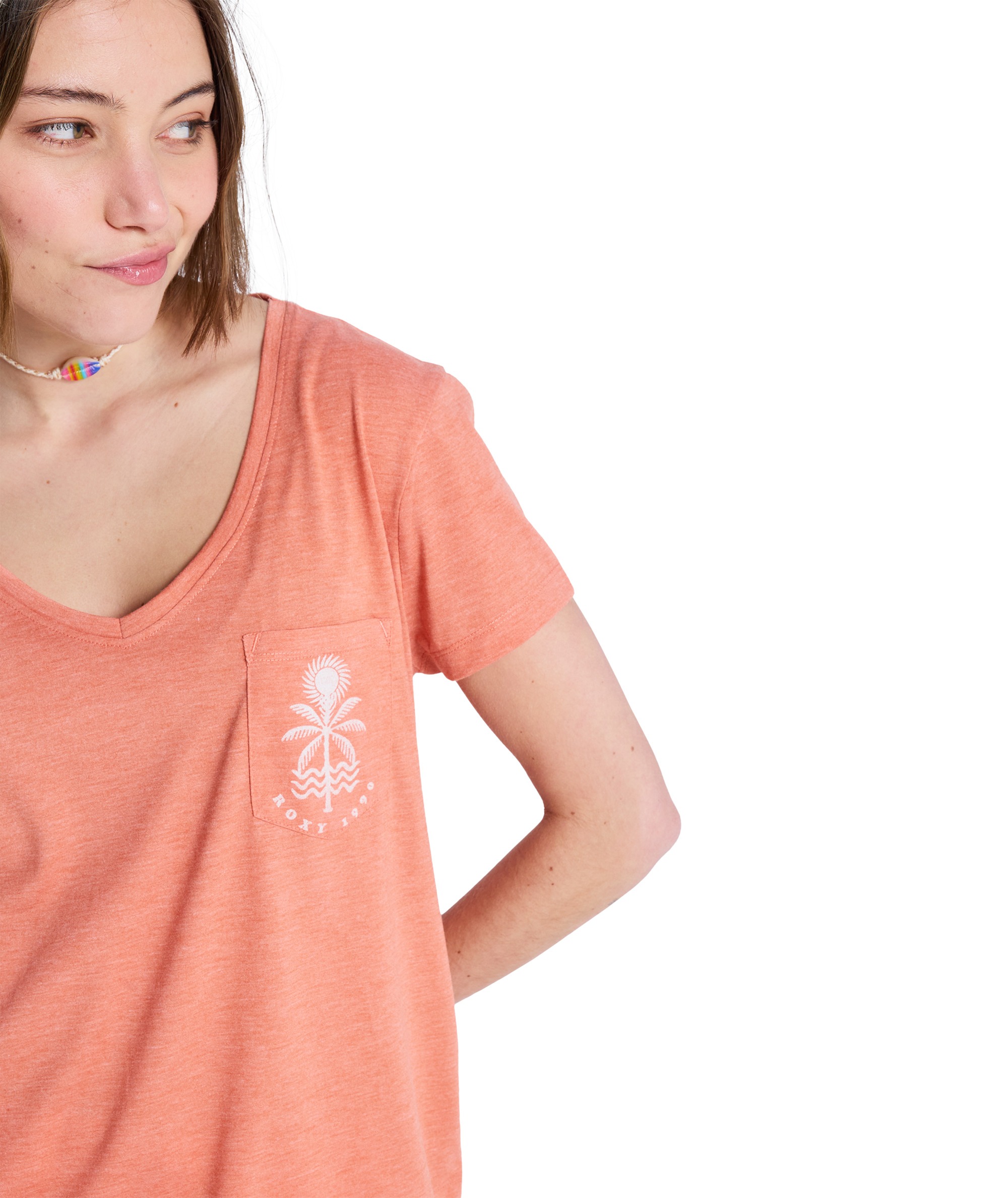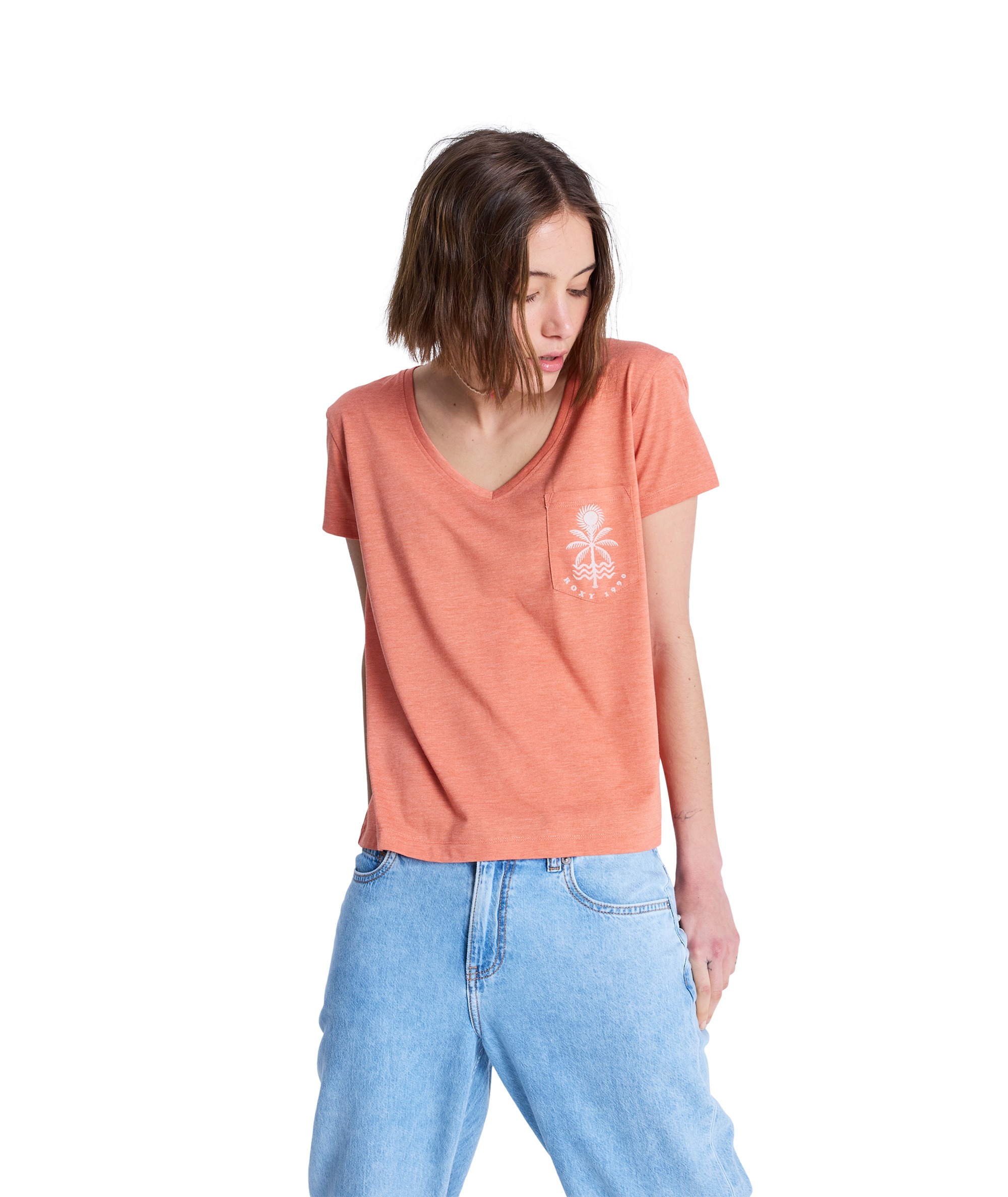 Model posiada głęboki dekolt w szpic (V-neck) z wykończeniem ściągaczem, praktyczną kieszonkę na piersi oraz sitodruk na kieszeni i na plecach, który nadaje koszulce nowoczesnego charakteru. Dzięki praniu garment i bio wash t-shirt jest miękki, wygodny i przyjazny w noszeniu na co dzień.
