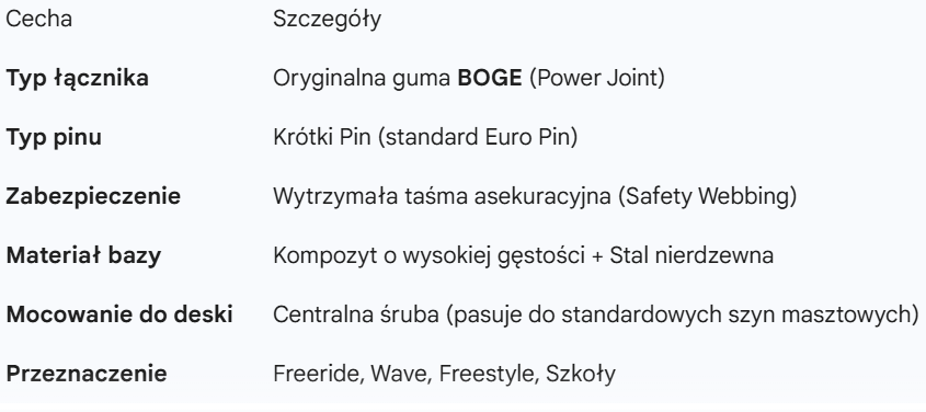 Paleta Infinity Excellent BOGE to propozycja dla windsurferów, którzy szukają maksymalnej stabilności i pewnego połączenia z deską. Model ten, podobnie jak wersja Prime, bazuje na legendarnym, oryginalnym łączniku gumowym marki BOGE, jednak wyróżnia się szerszą, ergonomiczną podstawą (talerzykiem). Taka konstrukcja zapewnia lepszy rozkład sił nacisku na szynę masztową i pokład deski, co jest szczególnie istotne przy większych przeciążeniach i częstym manewrowaniu.