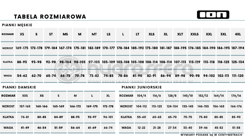 - zapięcie typu FRONT ZIP - poziome zapięcie przednie - zapewniające lepszą szczelność, choć mniej komfortowe w zakładaniu