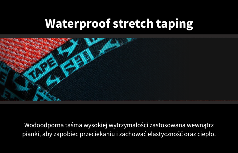 Zastosowanie konstrukcji szwów GBS (klejonych i ślepo szytych) w połączeniu z 100% wodoodpornym, elastycznym podklejeniem wszystkich połączeń skutecznie ogranicza przenikanie wody, zwiększając komfort cieplny i trwałość produktu. Przedni zamek YKK ułatwia zakładanie i zdejmowanie, a zintegrowany Aquabarrier dodatkowo chroni przed napływem zimnej wody.