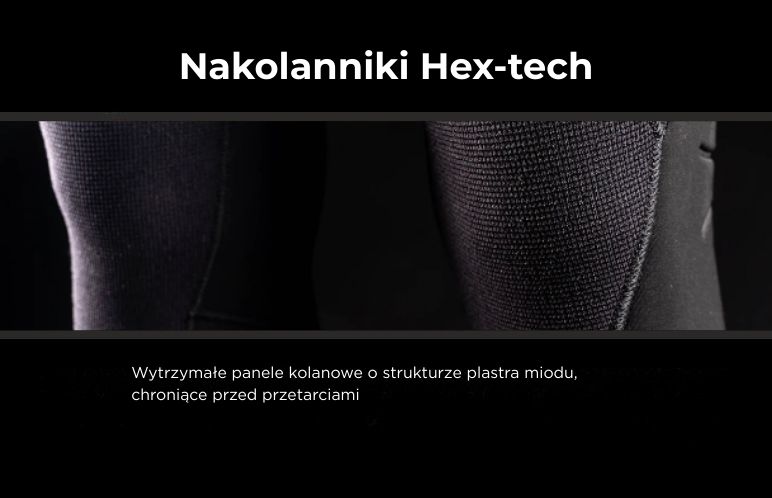 Dopracowane detale techniczne realnie wpływają na wygodę użytkowania. Tłoczenia w tylnej części kolan poprawiają mobilność podczas ruchu, natomiast ochraniacze kolan Hex-tech zwiększają odporność na przetarcia w newralgicznych miejscach. Antypoślizgowe mankiety z termicznie uszczelnionymi krawędziami zapewniają stabilne dopasowanie i ograniczają straty ciepła.
