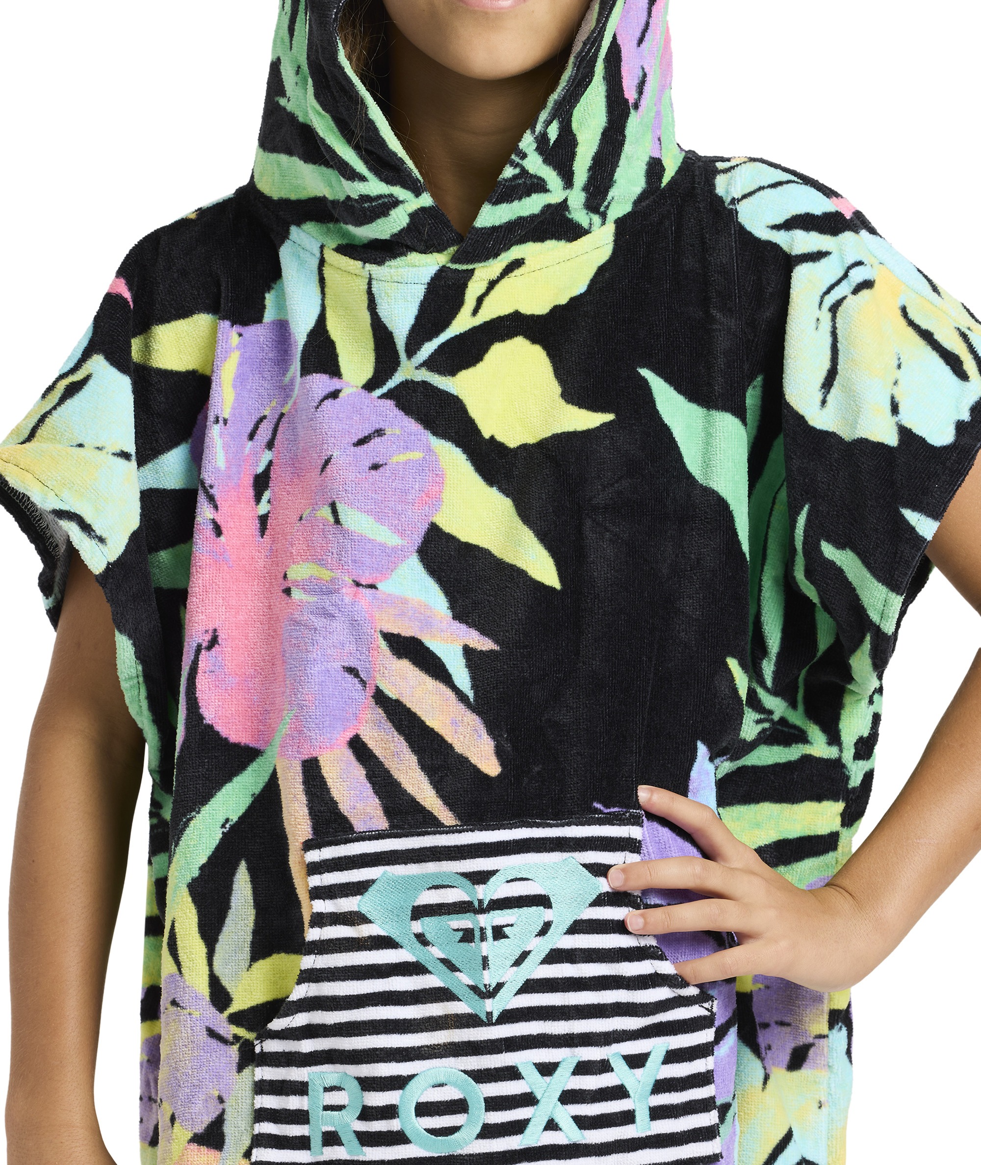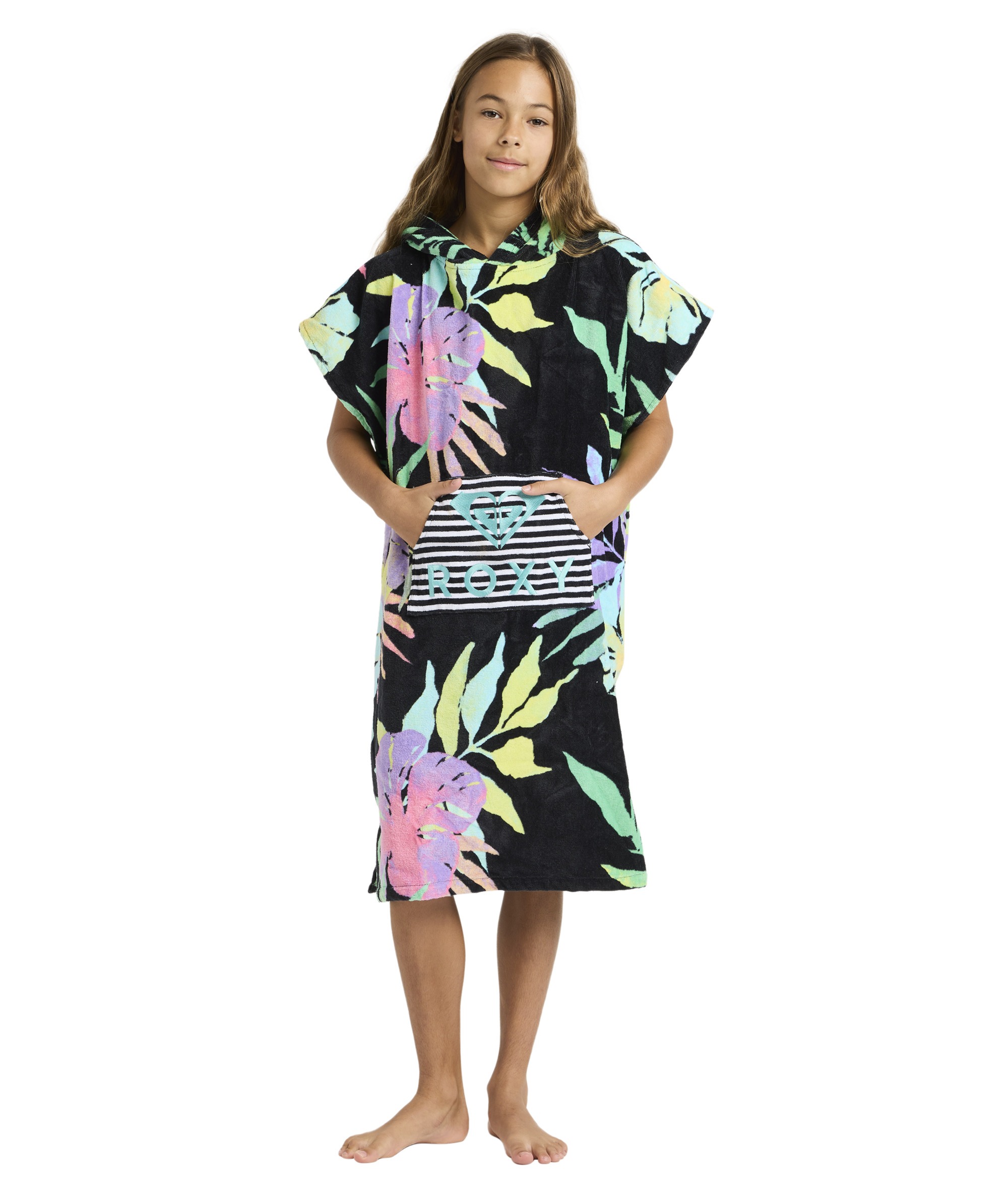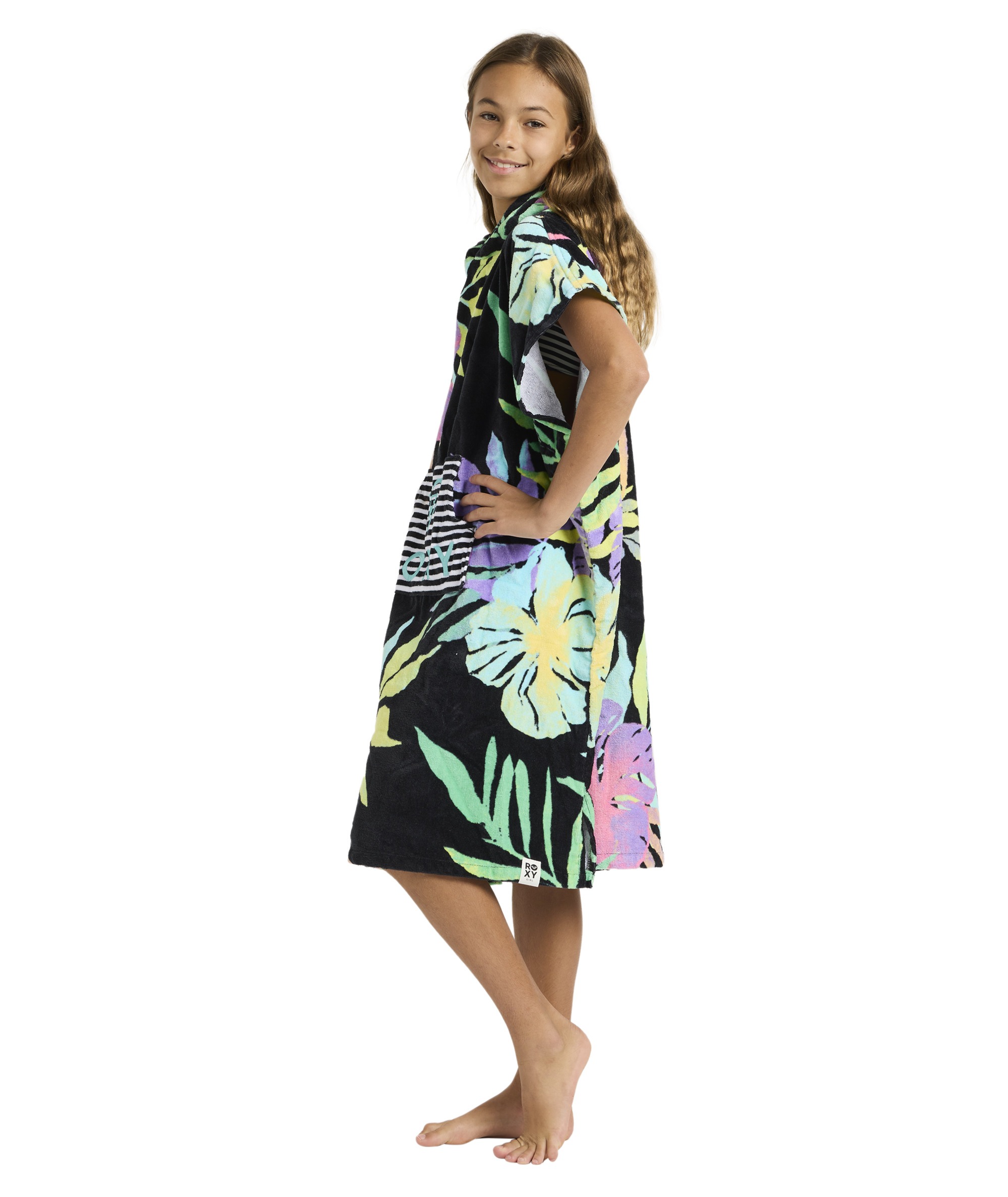 RG STAY MAGICAL PRINTED to wygodne i funkcjonalne poncho-ręcznik wykonane z wysokiej jakości 100% bawełny frotte. Miękka i chłonna tkanina zapewnia komfort po kąpieli, pływaniu oraz innych aktywnościach wodnych. Model wyposażony jest w praktyczną przednią kieszeń typu kangurka, która zwiększa wygodę użytkowania. Poncho doskonale sprawdzi się na plaży, basenie oraz podczas wakacyjnych wyjazdów. Całość uzupełnia haftowane logo Roxy, podkreślające markowy charakter produktu.