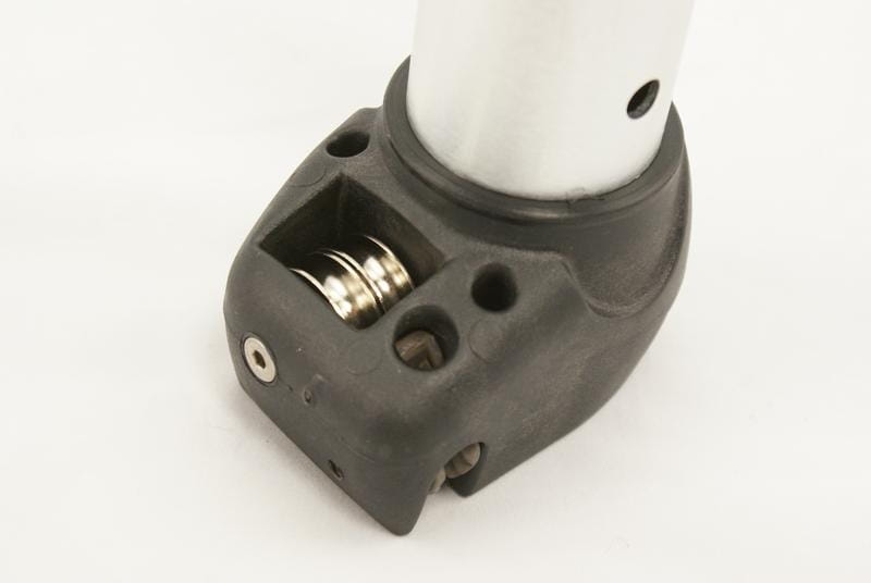 Kluczową cechą tego modelu jest zastosowanie układu 2 rolek poprzecznych (Across), który rewolucjonizuje sposób przewlekania linki. Poprzeczne ustawienie rolek sprawia, że linka przebiega równolegle do bloczków żagla, co eliminuje jej krzyżowanie się i skręcanie. Dzięki temu tarcie zostaje zredukowane do minimum, co pozwala na lekkie i płynne trymowanie żagla nawet przy użyciu mniejszej siły. Przedłużka pracuje w standardzie Euro Pin, co gwarantuje pełną kompatybilność z większością baz dostępnych na rynku. Bezpieczną regulację długości zapewnia stalowy pierścień blokujący, a naniesiona skala pozwala na precyzyjne ustawienie parametrów w skokach co 2,5 centymetra. Podstawę konstrukcji wieńczy solidna, zintegrowana knaga, która pewnie trzyma linkę w każdych warunkach.