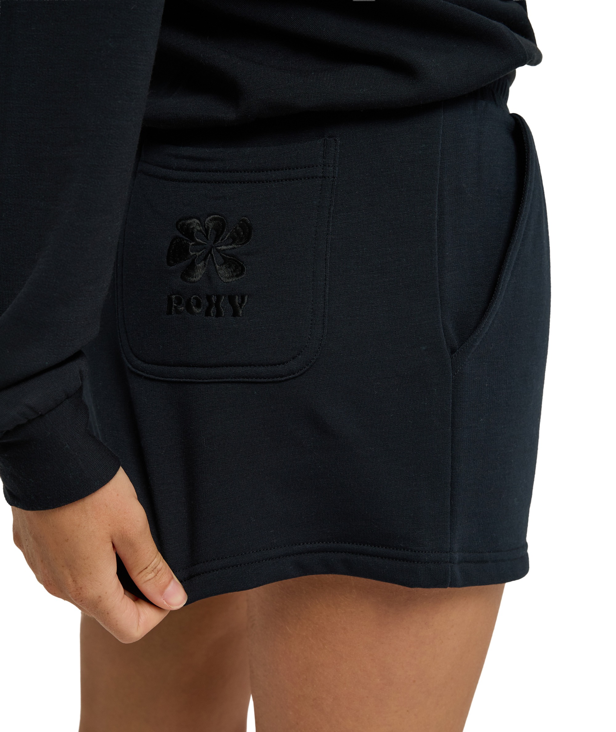 Model posiada elastyczny pas z regulacją sznurkiem z tego samego materiału, praktyczne kieszenie boczne oraz subtelny haft na tylnej kieszeni, który dodaje szortom charakterystycznego detalu. Długość nogawki wynosi 30 cm (11,8"), co zapewnia wygodę i swobodę ruchu.