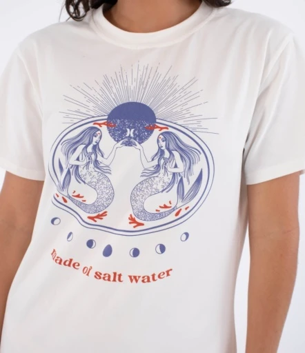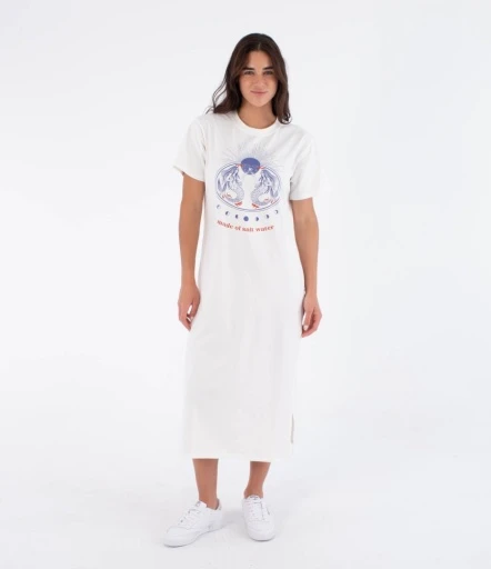dobre dopasowanie oraz swobodę ruchów przez cały dzień. Model ma długość midi i klasyczny krój typu T-shirt, który świetnie układa się na sylwetce. Krótkie rękawy oraz okrągły dekolt nadają sukience casualowy charakter, idealny do codziennych stylizacji. Rozcięcie z boku dodaje lekkości i funkcjonalności podczas chodzenia. Przód sukienki zdobi wyrazista grafika z motywem syren i napisem „Made of salt water”, która podkreśla surferskie DNA marki Hurley. Kolor sprawia, że sukienka jest uniwersalna i łatwa do zestawienia z trampkami, sandałami lub klapkami.