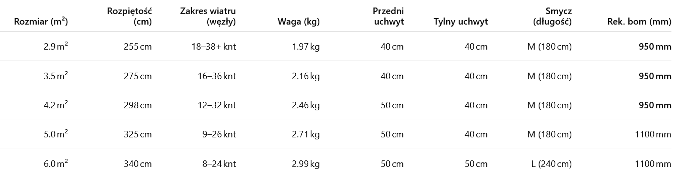 - Utrzymanie kształtu w górnym zakresie wiatru