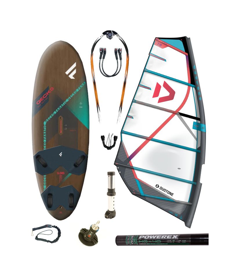 Zestaw składa się z używanej deski Fanatic Gecko Eco 122L, żagla Duotone E_Pace 6,6, masztu Powerex HQ40 430 SDM,